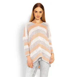 Voľný oversize strih. Sveter s trojfarebnými pruhmi. Špicatý výstrih. Výstrih do V na chrbte.