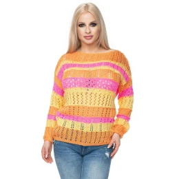 Krátky pulóver s ažurovou väzbou. Sveter s farebnými pruhmi. Sveter z mäkkej priadze.