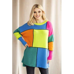 Sveter s dlhými rukávmi a voľným strihom, zastrčený cez hlavu. Zadná časť svetra je o niečo dlhšia. Sveter s farebným blokovým vzorom.
