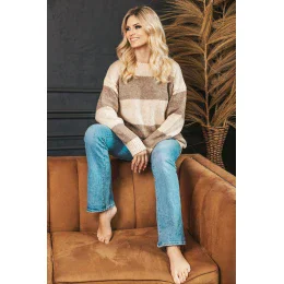 Dámsky sveter s dlhými rukávmi a voľným strihom s farebnými pruhmi.