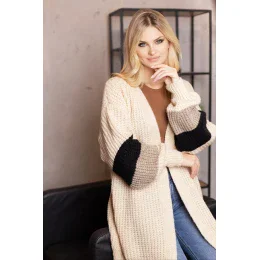 Vkusný kardigán voľného strihu, otvorený s dlhými rukávmi. Kontrastné pruhy na rukávoch.