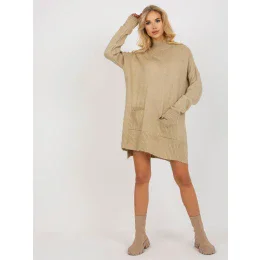 Béžový dlhý oversize sveter s vreckami a polovičným rolákom.