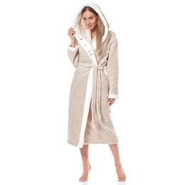 Dlhý pohodlný dámsky župan, ktorý je vyrobený z mäkkej tkaniny.