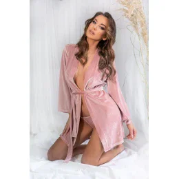Očarujúci velúrový župan s čipkou a tylovou vsadkou na chrbte v krásnej púdrovo ružovej farbe. Zaväzovanie v páse. Mäkká tkanina s jemným perleťovým leskom.