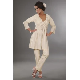 Pohodlný bavlnený župan svetlej farby s výšivkou na hrudi. Univerzálny, ideálny na všetky ročné obdobia, mäkký a elegantný, strih a la kimono, voľný a splývavý lem, rukávy v 3/4 dĺžke, zaväzovanie vpredu. 95 % bavlna, 5 % elastan.