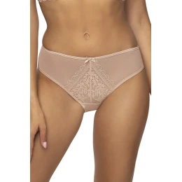 Čipkované tangá v béžovej farbe. Čipka s kvetinovým motívom, sieťovaná vložka vpredu, saténová mašľa v páse. Bavlnený klin.