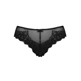Nebezpečne zvodné tangá Leyla. Čierne čipkované, priehľadné nohavičky sexi objímajú ženský pôvab. Bavlnený klin.