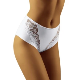 Gabe sú mierne plnšie nohavičky, ktoré dokonale priľnú k telu a pružne ho tvarujú. Úplne hladký chrbát a predný diel sú prešpikované ozdobnou čipkou, ktorá koketne prechádza v prednej časti kompozície. Veľké, jemné kvety s krásne rozkvitnutými pukmi sa tu stávajú inšpiratívnym a výrazným prvkom, ktorý vnáša úžasný, veľmi ženský vzhľad. Komfort v kombinácii s elegantným šarmom.