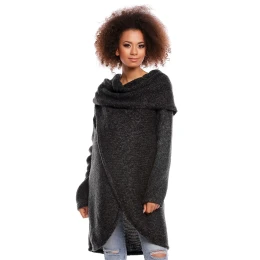 Tehotenský sveter so širokým, voľným rolákom s asymetrickým, prekrývajúcim sa predným dielom. Elegantný a jedinečný dizajn pre budúce mamičky, ktoré si cenia pohodlie, teplo a originálny vzhľad. Sveter možno nosiť samostatne alebo ako doplnkové oblečenie. Sveter je vyrobený z mäkkej a nadýchanej priadze a nosí sa cez hlavu.
