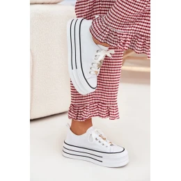 Tenisky z textilného materiálu s pevnou platformou sú módnou ponukou na každý deň. Šnurovanie s doplnkovými zlatými ozdobami, ktoré im dodávajú štýlový akcent. Sú ideálne na každodenné nosenie, spájajú pohodlie s moderným vzhľadom a hodia sa ku nohaviciam aj šatám.
