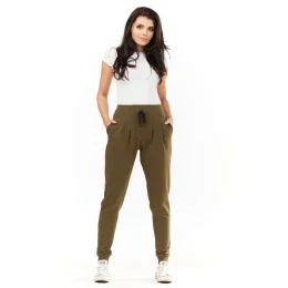 Pletené nohavice s bočnými vreckami. V páse šnúrka, nohavice zakončené gumičkou.