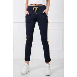 Dámske teplákové nohavice s elastickým pásom a viazaním. Nohavice s ozdobnými kontrastnými pruhmi na bokoch a nakladanými vreckami.