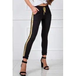 Dámske teplákové nohavice s elastickým pásom a viazaním. Nohavice s ozdobnými kontrastnými pruhmi na bokoch a nakladanými vreckami.