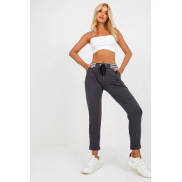 Dámske tepláky s elastickým pásom a viazaním. Nohavice s vysokým pásom a nakladanými vreckami na bokoch.