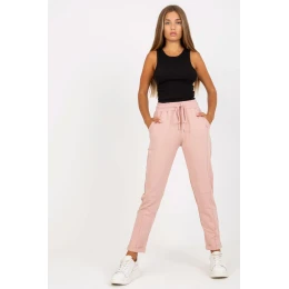 Dámske tepláky s vysokým pásom, zaväzovaním a elastickým pásom. Vrecká na bokoch.