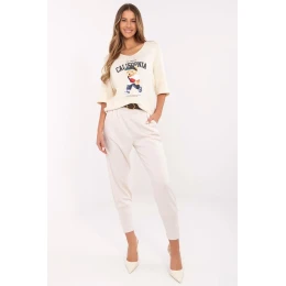 Elegantné dámske tepláky spájajúce ležérny štýl s nádychom elegancie. Sú vyrobené z kvalitnej zmesi polyesteru, viskózy a elastanu a zaručujú pohodlie a skvelý strih. Vysoký pás s gumou na zadnej strane zaručuje pohodlie pri nosení a zopnutý pás zvýrazňuje pás a dodáva eleganciu. Vďaka hladkému materiálu sú nohavice skvelým kúskom na každodenné nosenie, do práce alebo na formálne udalosti. Model má bočné vrecká a nohavice sú zakončené lemami, čo im dodáva moderný charakter. Ideálne pre ženy, ktoré ocenia štýl a pohodlie.