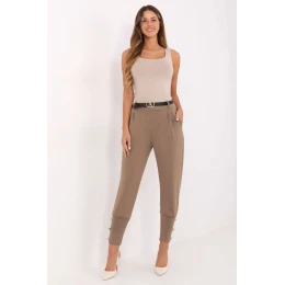 Moderní a pohodlné dámské teplákové kalhoty v casual stylu, ideální na každý den i do práce v uvolněném provedení. Vyrobeny z příjemné směsi viskózy a polyesteru, zaručují pohodlí nošení a elegantní, propracovaný vzhled. Model s vysokým pasem a sešněrovanými nohavicemi skvěle zdůrazňuje postavu, zároveň zajišťuje volnost pohybu. Na zadní straně pasu je vsazena elastická guma, díky čemuž kalhoty dokonale sedí na postavě. Pro větší funkčnost jsou vybaveny bočními kapsami a zapínacím páskem, který jemně zdůrazňuje pas. U spodní části nohavic jsou široké manžety s ozdobnými knoflíčky, které dodávají celku stylový charakter. Skvělá volba pro ženy, které oceňují kombinaci pohodlí a městské elegance, ideální do práce, na procházku nebo setkání s přáteli.