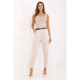 Moderní a pohodlné dámské teplákové kalhoty v casual stylu, ideální na každý den i do práce v uvolněném provedení. Vyrobené z příjemné směsi viskózy a polyesteru, zaručují pohodlí nošení a elegantní, propracovaný vzhled. Model s vysokým pasem a se zužujícími se nohavicemi skvěle zdůrazňuje postavu a zároveň poskytuje volnost pohybu. V pasu vzadu je vsazena elastická guma, díky čemuž kalhoty skvěle sedí a přizpůsobují se postavě. Pro větší funkcionalitu jsou vybaveny bočními kapsami, a zapínací pásek umožňuje decentně zdůraznit pas. Na spodních koncích nohavic jsou široké manžety s ozdobnými knoflíky, které dodávají celku stylový charakter. Jedná se o skvělou volbu pro ženy, které oceňují spojení pohodlí a městské elegance, ideální do práce, na procházku nebo setkání s přáteli.