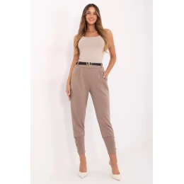 Moderní a pohodlné dámské teplákové kalhoty v casual stylu, ideální na každý den a do práce v uvolněném provedení. Vyrobené z příjemné směsi viskózy a polyesteru, zaručují pohodlí nošení a elegantní, propracovaný vzhled. Model s vysokým pasem a se zužujícími se nohavicemi skvěle zdůrazňuje postavu, zároveň poskytuje volnost pohybu. V pasu na zadní straně je vsazena elastická guma, díky čemuž se kalhoty ideálně přizpůsobí postavě. Pro větší funkcionalitu jsou vybaveny postranními kapsami na zip a zipovým páskem, který jemně zdůrazňuje pas. Na spodním lemu nohavic jsou široké manžety s ozdobnými knoflíky, které přidávají celému outfitu stylový charakter. Je to skvělá volba pro ženy ocení spojení pohodlí a městské elegance, ideální do práce, na procházku nebo setkání s přáteli.