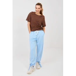 Pohodlné tepláky typu joggery jsou skvělým návrhem pro každodenní casual stylizace. Skvěle se hodí jak na běžné nošení, tak i do práce v méně formálním dress codu, kombinujíc pohodlí nošení s moderním vzhledem. Hladký vzor jim dodává univerzální charakter a usnadňuje kombinování s různými kousky šatníku. Tepláky jsou vyrobené z měkké a příjemné viskózy s přídavkem elastanu, co zajišťuje lehkost, pružnost a volnost pohybu po celý den. Vysoký pas zdůrazňuje pas a zajišťuje pohodlné padnutí, a šňůrka v pase umožňuje individuální úpravu. Nohavice jsou zakončeny stahovacími manžetami s šňůrkou, které dávají teplákům sportovně-městský charakter a zajišťují dobré padnutí. Praktickým doplňkem jsou boční kapsy, ideální pro drobnosti. Jedná se o univerzální model, který skvěle ladí s mikinou, tričkem nebo elegantní košilí, vytvářející stylový a pohodlný vzhled.