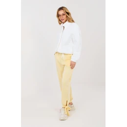 Pohodlné tepláky typu jogger jsou skvělým návrhem pro každodenní stylování ve stylu casual. Skvěle se hodí jak do každodenního života, tak i do práce v méně formálním dress codu, spojují pohodlí nošení s moderním vzhledem. Hladký vzor jim dodává univerzální charakter a usnadňuje jejich kombinování s různými kousky oblečení. Tepláky jsou vyrobeny z měkké a příjemné viskózy s přídavkem elastanu, co zajišťuje lehkost, pružnost a volnost pohybu po celý den. Vysoký pas zdůrazňuje pas a zajišťuje pohodlné přiléhání, šňůrka v pase umožňuje individuální úpravu. Nohavice jsou zakončeny pružnými manžetami s šňůrkou, které dávají tepláky sportovně-městský charakter a zajišťují dobré přiléhání. Praktickým doplňkem jsou postranní kapsy, ideální na drobnosti. Jedná se o univerzální model, který skvěle ladí s mikinou, tričkem nebo elegantní košilí, vytvářející stylový a pohodlný vzhled.