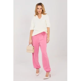 Elegantní teplákové kalhoty typu jogger jsou kombinací pohodlí a stylového provedení. Model s dlouhými nohavicemi zakončenými manžetami skvěle padne na postavu, dodává celku moderní charakter. Hladký vzor zdůrazňuje jejich všestrannost a dělá je skvělými pro každodenní i sofistikované stylizace. V pase je vsazena elastická guma, která zajistí pohodlné přizpůsobení a pohodlí při nošení po celý den. Boční kapsy přidávají funkčnost a jemná brož v podobě květu dodává elegantní ženský akcent. Kalhoty jsou vyrobeny z velmi příjemného materiálu jako je máslo, jemné a hebké směsi polyesteru, viskózy a elastanu. Materiál se krásně přizpůsobuje tělu, poskytuje volnost pohybu a vysoký komfort při nošení. Je to ideální volba pro ženy, které ocení pohodlí v elegantním provedení.