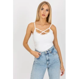 Tričko z rebrovanej tkaniny, s ramienkami. Výstrih zdobený čipkou s ozdobnými prúžkami.