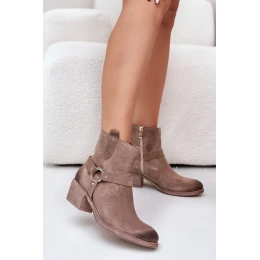 Dámske čižmy z prírodného semišu. Stoja na nízkom podpätku. Mandľový tvar špičky. Vnútorná strana z plsti na udržanie tepla počas chladnejších dní. Zapínanie na zips. Pruhy na zvršku. Tento model sa bude skvele hodiť ku nohaviciam a šatám.