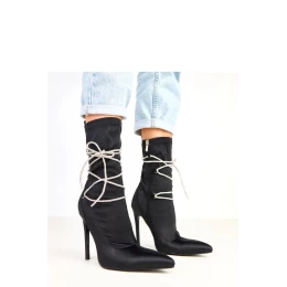 Výnimočné dámske čižmy z elegantného saténu, ktoré pútajú pozornosť vďaka ozdobným šnúrkam zdobeným zirkónmi. Oblúkovitá špička a štíhly 12 cm podpätok dodávajú celku zmyselný a luxusný charakter. Model má 21 cm vysoký nárt, ktorý krásne zvýrazňuje líniu nôh, a praktické zapínanie na zips zaručuje pohodlné nosenie. Vnútro tvorí mäkká tkanina bez dodatočného polstrovania, vďaka čomu sú ideálnou voľbou na jarno-letnú sezónu alebo elegantné udalosti. Sú to efektné a lesklé čižmy, ktoré dokonale doplnia večerné outfity, dodajú im eleganciu a oslnivý charakter.