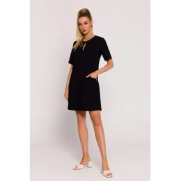 Informácie o výrobku: Pletená textília Šaty áčkového strihu s krátkymi rukávmi Výstrih s kľúčovou dierkou Vrecká na prednom šve s ozdobným odznakom s logom bez podšívky Náš model je vysoký 171 cm a nosí veľkosť S Navrhnuté a vyrobené v Poľsku