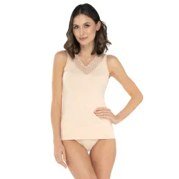 Elegantná hladká blúzka s krásnou čipkovou ozdobou pozdĺž výstrihu. Základný model, s neveľkým, pohodlným výstrihom, strihaný na širšie ramienka, ideálny pre mnoho rôznych štylizácií.