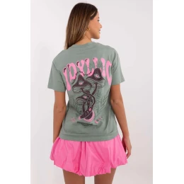 Toto dámske tričko klasického strihu je vyrobené z kvalitnej bavlny, ktorá zaručuje pohodlné nosenie. Prednú časť zdobí jemná potlač s nápismi, ktorá dodáva tričku módny, minimalistický charakter. Zadnú časť zdobí potlač v kombinácii s dynamickými nápismi, ktorá celku dodáva originálny výraz. Model štandardnej dĺžky s krátkymi rukávmi a okrúhlym výstrihom sa dokonale hodí do každodenných štylizácií. Ideálna voľba pre ženy, ktoré ocenia pohodlie a štýl v jednom.