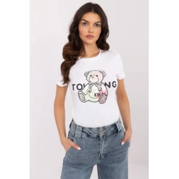Pôvabné a štýlové dámske tričko, ideálne na každý deň. Je vyrobené z mäkkej bavlny s prídavkom elastanu, poskytuje pohodlie a skvele sa prispôsobí postave. Vďaka klasickému okrúhlemu výstrihu a štandardnej dĺžke je vhodné na mnohé štylizácie. Krátke rukávy mu dodávajú ľahkosť a originálne detaily, ako napríklad výšivka v tvare medvedíka s flitrami, mu dodávajú jedinečný charakter. Ideálna voľba pre ženy, ktoré ocenia ležérny štýl s módnymi akcentmi.