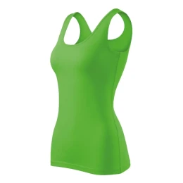 elastický materiál na udržanie tvarovej stability priliehavý strih s bočnými švami hlbší okrúhly výstrih výstrih a prieramky podšité vrchným materiálom širšie ramienka