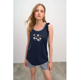 Dvojdielne dámske pyžamo pre pohodlný spánok. Komplet pozostáva z košieľky na ramienka s kvetinovou potlačou, ktorú dopňujú krátke kockované šortky s pohodlnou gumou v páse. Pyžamo je vyrobené z vysoko kvalitnej, genetický nemodifikovanej gréckej bavlny, ktorá poskytuje vysoké pohodlie, príjemný pocit na dotyk, priedušnosť, pružnosť a odolnosť.
