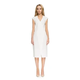 Ostré strihy a vypasovaný strih zvýrazňujú ženské krivky a upútavajú pozornosť na tieto originálne šaty s ozdobnými gombíkmi.