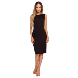 Tieto klasické ceruzkové šaty bez rukávov s nádychom sofistikovanosti odhaľujú ramená a zvýrazňujú krivky, s hlbokým výstrihom na chrbte zdobeným retiazkou. Šaty sa zapínajú na krytý zips.