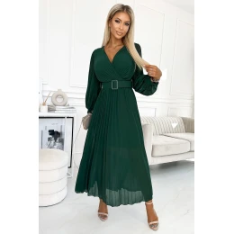 Plisované šifónové šaty s výstrihom, dlhými rukávmi a opaskom. Plisovanie na výstrihu a rukávoch dodáva šatám eleganciu. Šaty vo fľaškovo zelenej farbe. Značka numoco.