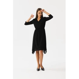 Tu sú krásne šaty z mäkkého šifónu, ktorý im dodáva ľahkosť a jemnosť. Šaty majú asymetrický vrstvený lem, ktorý im dodáva originalitu a ľahkosť. Výstrih do V je elegantný a klasický. Elastický lem v páse zvýrazňuje pás a zároveň poskytuje pohodlie. 7/8 dlhé rukávy dodávajú šatám moderný nádych. Dĺžka šiat siaha nad kolená, čo im dáva univerzálnosť na rôzne príležitosti. Čiastočne podšité pre väčšie pohodlie a správne zakončenie. Šaty sú ideálne na každý výlet, večierok alebo stretnutie s priateľmi, ktorým dodajú nádych jemnosti a elegancie. Navrhnuté a ušité v Poľsku.
