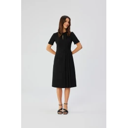 Šaty, které byly vytvořeny s důrazem na detail, jsou jedinečným kouskem oděvu navrženým a ušitým v Polsku, což podtrhuje vysokou kvalitu zpracování a místní charakter. Ozdobné záhyby na bocích šatů dodávají celkovému vzhledu jedinečný nádech a dodávají šatům osobitý a originální vzhled. Slzovitý výstřih dodává šatům jemnost a zvýrazňuje jemně odhalený hrudník. Přestřižení v pase vnáší do střihu eleganci a zdůrazňuje ženské křivky. Krátké ohrnuté rukávy dodávají šatům lehkost a působí ležérně. Spodní část ve tvaru písmene A zajišťuje šatům pohodlí a zároveň dodává jemný, decentní tvar ženské siluetě. Díky délce pod kolena jsou šaty vhodné jak pro formálnější příležitosti, tak pro každodenní nošení. Skrytý zip na zadní straně usnadňuje oblékání a svlékání šatů a zároveň zachovává jejich elegantní vzhled. Díky absenci podšívky látka příjemně sedí na těle a zůstává lehká a pohodln