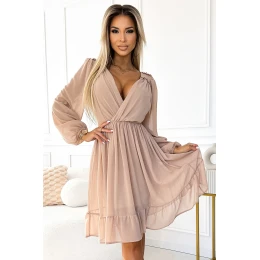 Šifónové midi šaty s dlhými rukávmi a elegantne zakončeným výstrihom. Šaty sú béžovej farby. Celé šaty sú podšité. Značka numoco. Poľská výroba.