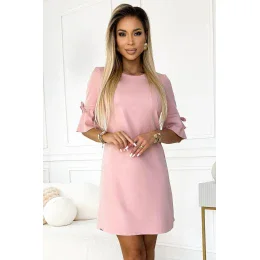 Pohodlné trapézové šaty s rozšírenými rukávmi a mašľami, veľmi ženské. Šaty v púdrovo ružovej farbe s trblietkami. Poľský výrobok. Značka numoco.