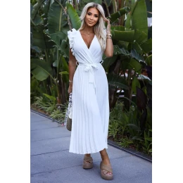 Plisované šaty s obálkovým výstrihom, opaskom a jemnými volánmi. Vyrobené z krepovej bielej látky. Ideálne šaty na každú príležitosť. Značka numoco basic. Európska výroba.