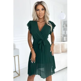 Tieto šifónové plisované šaty značky Numoco Basic sú elegantnou voľbou v krásnej zelenej farbe. Šaty majú decentný výstrih a jemné volániky na ramenách, ktoré im dodávajú ženský šarm. Plisovaný lem dodáva kreácii ľahkosť, zatiaľ čo opasok v páse umožňuje dokonale zvýrazniť siluetu. Tieto šaty sú vyrobené z ľahkého a vzdušného šifónu a sú ideálnou voľbou na výnimočné príležitosti. Vyrobené v Európe, spájajú štýl a pohodlie a zaručujú vysokú kvalitu spracovania.