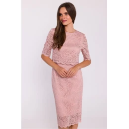 Elegantní dvouvrstvé tužkové šaty, které kombinují klasickou hladkou látku ve spodní části s jemnou krajkovou vnější vrstvou a vytvářejí tak elegantní a ženský vzhled. Šaty jsou v pase vykrojené, což zvýrazňuje pas a dodává siluetě proporce. Krátké krajkové rukávy dodávají šatům lehkost a jemný půvab. Délka pod kolena a rozparek na zádech zajišťují pohodlí a volnost pohybu a zároveň zdůrazňují elegantní charakter střihu. Krytý zip na zádech umožňuje diskrétní přizpůsobení postavě. Šaty byly navrženy a ušity v Polsku, což je zárukou nejvyšší kvality zpracování a důrazu na detail. Ideální pro zvláštní příležitosti, kdy chcete vypadat elegantně a na úrovni. . Složení: Svršek: 90 % nylon, 10 % spandex . Spodní část: 95% polyester, 5% elastan.