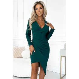 Asymetrické šaty s dlhými rukávmi, výstrihom a nariasením - fľaškovo zelené. Vyrobené z matnej mierne elastickej tkaniny (95 % polyester, 5 % elastan). Značka numoco. Poľská výroba. LIMITOVANÁ EDÍCIA