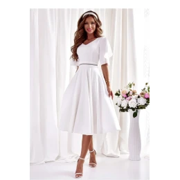 Tieto elegantné šaty v krémovom odtieni sú ideálnou voľbou na výnimočné udalosti. Sú vyrobené z kvalitného materiálu, dokonale sedia na postave a zvýrazňujú jej prednosti. Model má výstrih do V, ktorý jemne zvýrazňuje krk a kľúčne kosti. Rukávy s voľným nariaseným strihom dodávajú šatám ľahký a romantický charakter. Pás je zvýraznený ozdobným opaskom s jemným zdobením, ktorý krásne zvýrazňuje postavu. Rozšírená spodná časť dodáva kreácii ľahkosť a eleganciu. Šaty sa zapínajú na skrytý zips, čo zaručuje pohodlie pri nosení a ideálne padnutie. Sú ideálne na svadby, večierky, krstiny a iné elegantné udalosti.