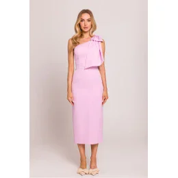 Elegantné midi šaty s oloveným strihom, ktorý zvýrazňuje ženskú postavu. Model očarí asymetrickým strihom s motívom na jedno rameno, zdobeným efektnou mašľou, ktorá dodáva eleganciu a jedinečný charakter. Vysoký rozparok na chrbte jemne zvýrazňuje nohu, čím dodáva kreácii ľahkosť a zmyselnosť. Šaty sa zapínajú na bokoch skrytým zipsom, ktorý zaručuje ideálne prispôsobenie. Čiastočná podšívka zaručuje pohodlie pri nosení. Navrhnuté a ušité v Poľsku s dôrazom na každý detail.