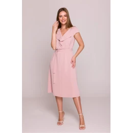 Elegantné šaty s jemne rozšíreným strihom v tvare písmena A, ktoré siahajú do dĺžky midi, tesne pod alebo mierne nad kolená. Sú vyrobené z hladkej tkaniny s jemným leskom, ktorý im dodáva výnimočný lesk. Výstrih do V je zdobený ozdobným volánom, ktorý zdôrazňuje ženskosť a dodáva ľahkosť. Krátke padajúce rukávy dokonale dopĺňajú celkový vzhľad a zaisťujú pohodlie pri nosení. Šaty sa zapínajú na boku skrytým zipsom, ktorý zaisťuje čistý vzhľad a pohodlie. V páse je látkový pás na zaväzovanie, ktorý umožňuje efektné zvýraznenie postavy. Šaty nemajú podšívku ani vrecká. Výrobok navrhnutý a ušitý s dôrazom na detail v Poľsku.