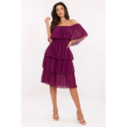 Lehké a ženské šaty ideální na teplé letní dny. Střih ve tvaru pláště krásně zdůrazňuje postavu a gumový pás zajišťuje pohodlí a přizpůsobení se postavě. Šaty sahají za kolena, nemají rukávy a jejich efektní výstřih typu hispanka jemně odhaluje ramena, dodávajíc lehkost a romantiku. Model je vyroben z kombinace polyesteru a viskózy, s hladkým vzorem a dodatečnou podšívkou, díky čemuž se dobře drží a neprosvítá. Celou plochu šatů zdobí volány, které jí dodávají výjimečný charakter. Šaty nemají zapínání, nasazují se přes hlavu. Hodí se jak na den, tak i na více slavnostní příležitosti, ideální na letní procházky, setkání s přáteli nebo rodinné oslavy.